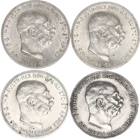 | 2201. | 1 Koruna 1913, 1914, 1915, 1916 vše b.zn. 4 ks | 0-1 | 550,- | --.- |