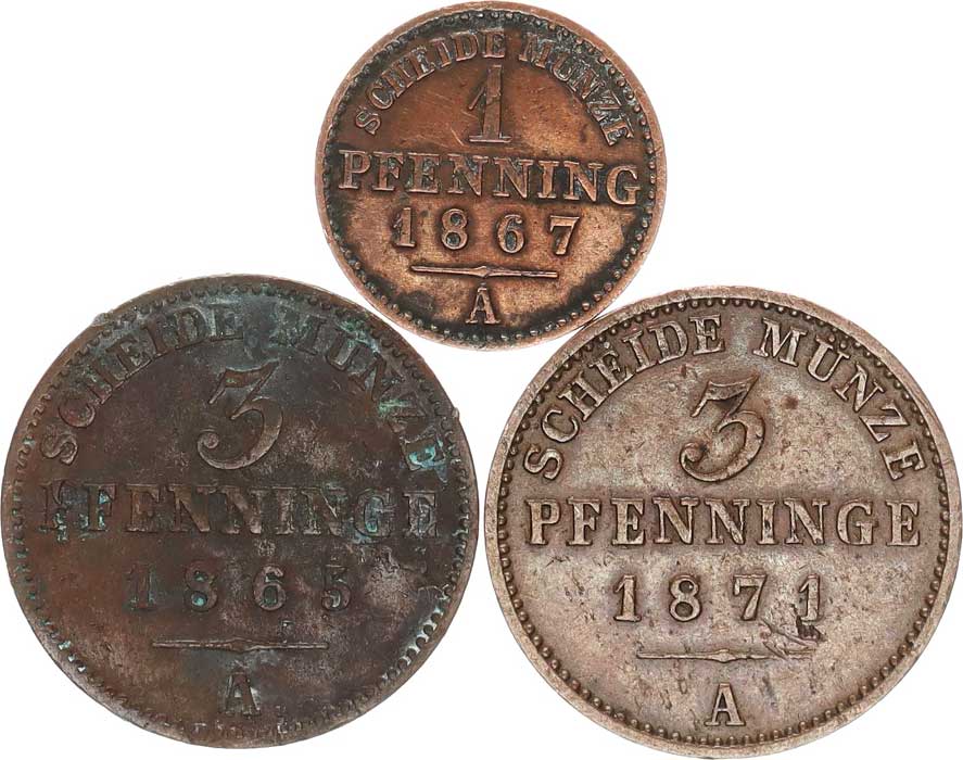 | 3308. | 3 Pfennige 1865 A, 1871 A; +1 Pfennig 1867 A 3 ks | 1-1- | 80,- | 165,- |