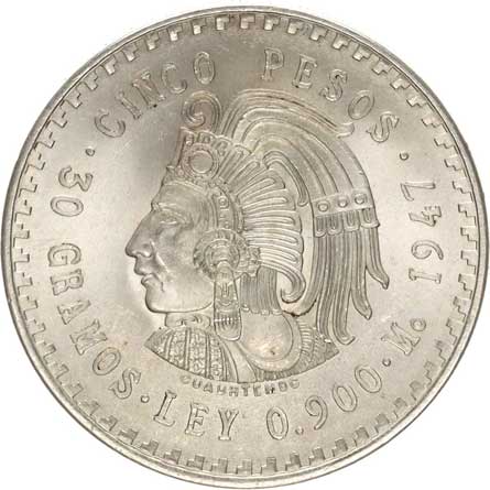 | 4749. | 5 Pesos 1947 Mo - Cuauhtemoc KM 465 Ag 900 30 g | 0/0 | 700,- | --.- |