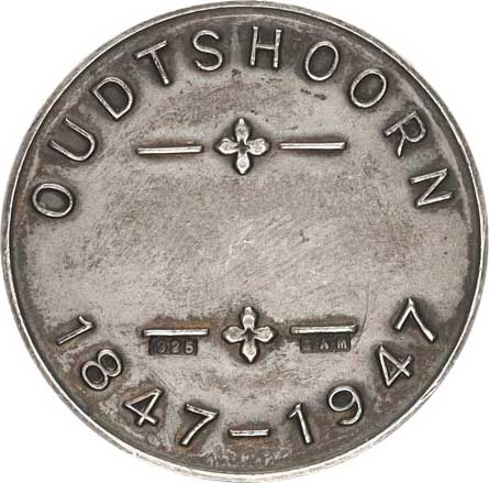 ho erbu Pegasové, ve stuze nápis MALO-MORI-QUAM-FOEDARI / nápis: OUDTSHOORN - 1847-1947 Ag punc 925 31,5 mm 18,249 g AM2 275; Laidlaw 0605; N 403601 |