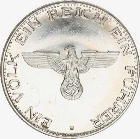 íty s hákovým křížem / Erby německých zemí včetně Rakouska, nápis Ein Reich, Ein Volk, Ein Führer sign.: K. GOEZ na hraně: Bay yer. Hauptmünzamt bílý kov 36 mm 19,35 g nep. koroze |