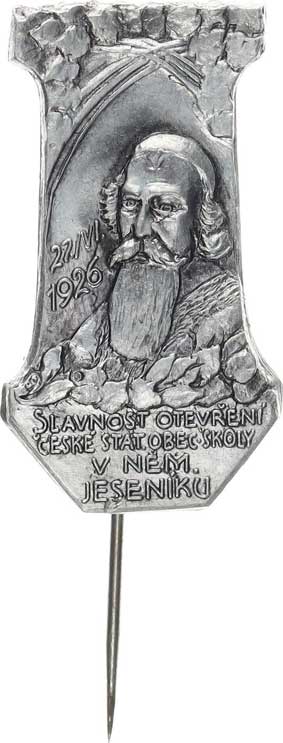 1927, rozevřená kniha, vlevo panoráma města, vpravo nápisy bronz. plech 46x32 mm jehlice |
