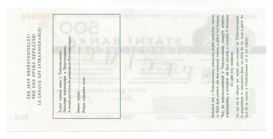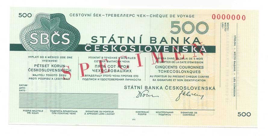 | 319. | Cestovní šek na 500 Kč, anulát, přetisk SPECIMEN, Novák: S 8a | N | 800,- | 800,- |