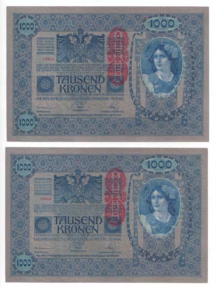 | 334. | 1000 Korun 1902/1920, sér.1580, přetisk Deutschoesterreich,
