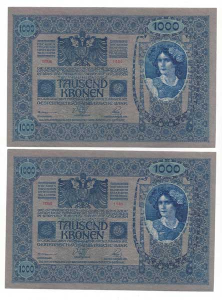 | 327. | 1000 Mark 1910, 7místný číslovač, Pick:45, 1x nep.zvln. okraj 2 ks | N- | 140,- | --.- |