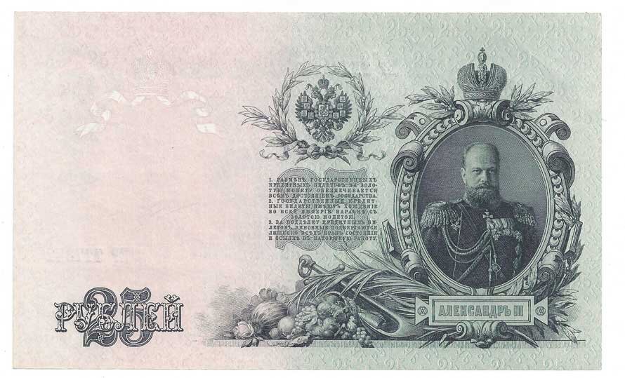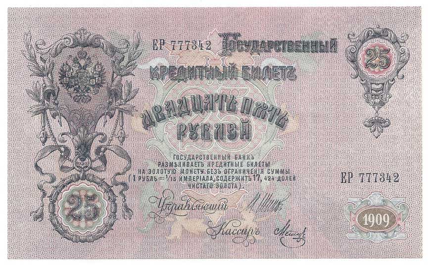 | 336. | 25 Rublů 1909, Šipov, sér.ER, Pick:12b, ohnuté (ne přeložené) uprostřed | N- | 40,- | 150,- |