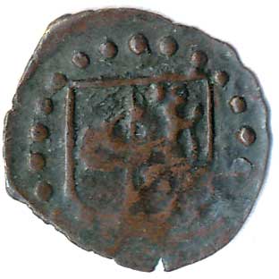 | 719. | Heller b.l. (16 století), v perlovém kruhu půlený znak s růží a lvem, měď 12mm,