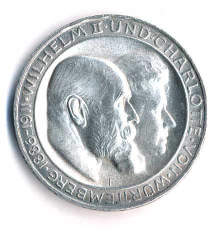 | 782. | 3 Mk. 1911 F, Württemberg, Wilhelm II. a Charlotte, stříbrná svatba | 0-1 | 850,- | 850,- |