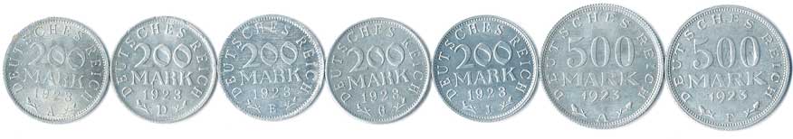 | 793. | 200 Mk.1923 A,D,E,F,J, 500 Mk.1923A,F, 7ks | 0-1 | 140,- | --.- |