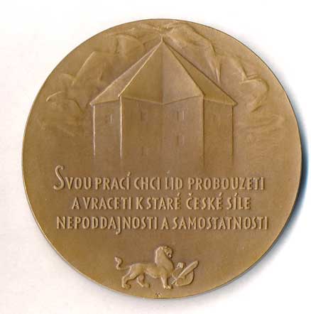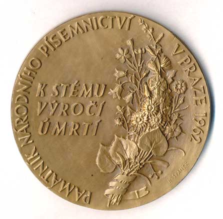 hlava zleva, v pozadí pražské památky , opis / ruce drtící ratolest, datace, opis, Br60 |