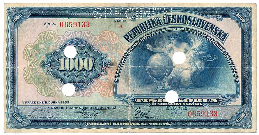 | 2025. | 1000 Kč 1932, s.A, SPECIMEN, 4x skartační otvor 10mm | 3- | 1500,- | --.- |