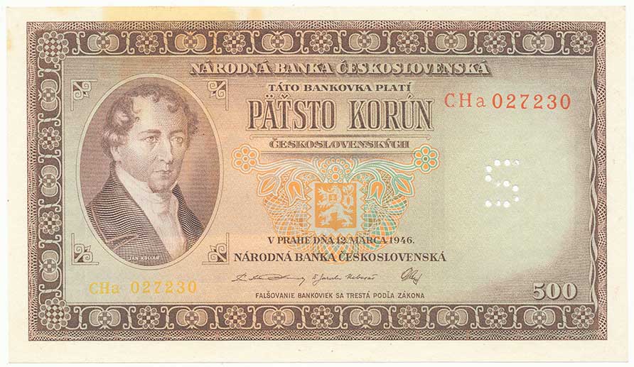 | 2075. | 500 Kčs1946, s.Cha, perforace S, vlevo nahoře zažloutlá | N | 600,- | 1200,- |