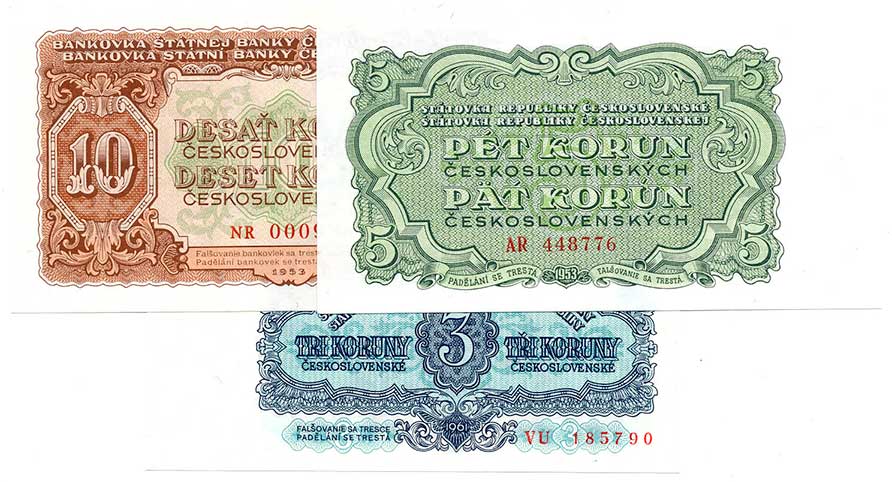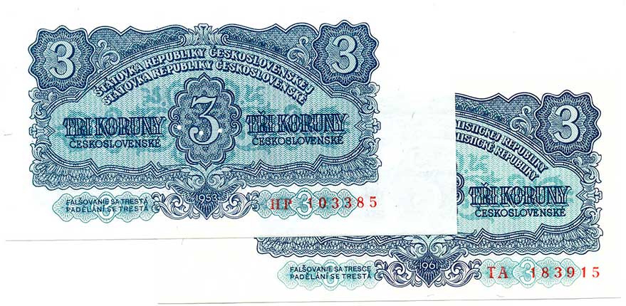 | 2080. | 1 Kčs 1953 s.VT, ČSR, 3 Kčs 1953, s.PT, ČSR, 2ks | N-1- | 60,- | 220,- |