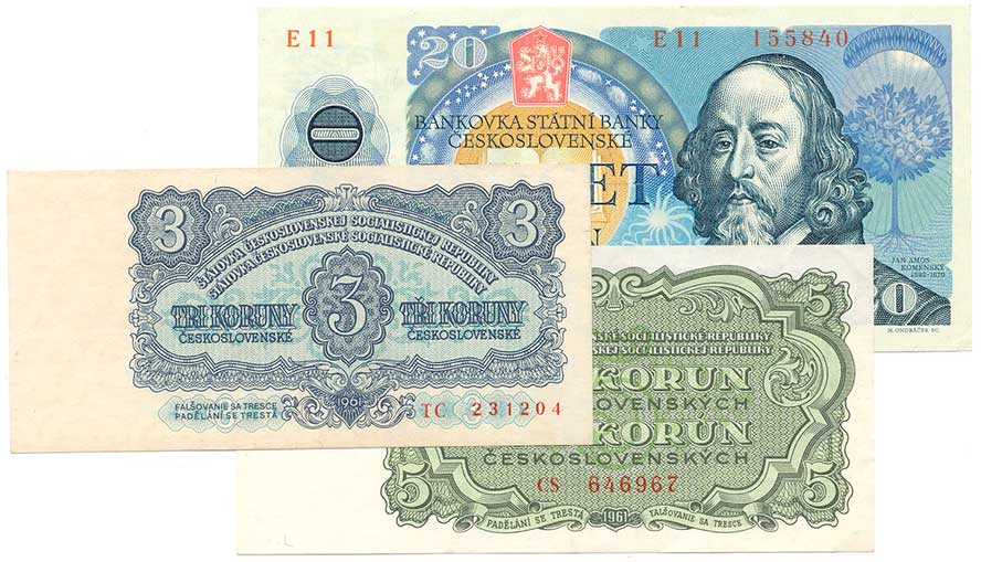 | 2087. | 3 Kčs 1961 s.TC, 5 Kčs 1961 s.CS, 20 Kčs 1988 s.E11, 3ks | N-1 | 160,- | 160,- |