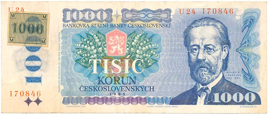 | 2104. | 1000 Kčs 1985 s.U24, lepený kolek | 2- | 2400,- | --.- |
