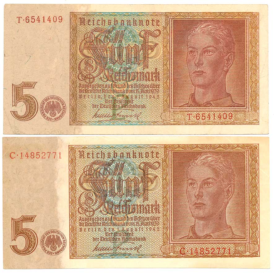 | 2124. | 5 Reichsmark 1.8.1942, s.T (7 čísel), s.C (8 čísel), 2ks | 1-2 | 100,- | 100,- |