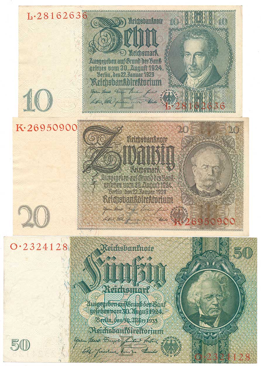 | 2125. | 10,20 Reichsmark 22.1.1929, 50 Reichsmark 30.3.1933, 3ks | N-0 | 120,- | 150,- |