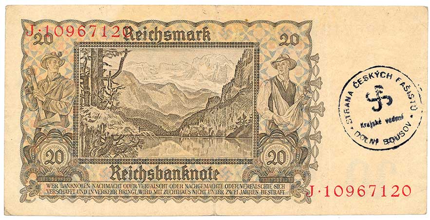 | 2126. | 20 Reichsmark 16.61939, s.B, nahoře 2 skvrnky | N | 200,- | 200,- |