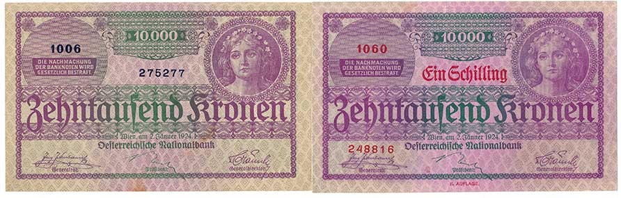 | 2137. | 10.000 K 1924, 10.000 K 1924 II.vydání, přetisk 1 Schilling, skvrnky, 2ks | 1 | 150,- | 950,- |