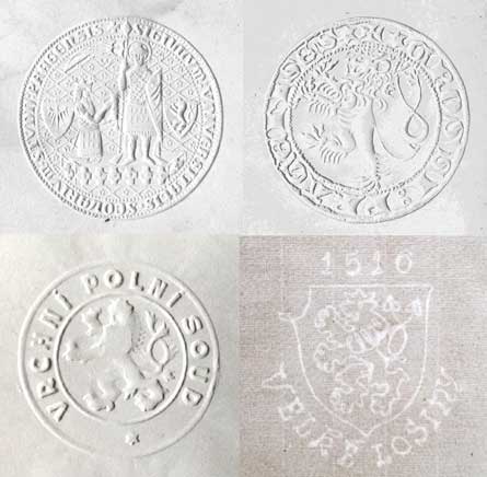 pražský groš, průměr 8cm, na papíru 20x21cm, VRCHNÍ POLNÍ SOUD, průměr 3,6cm, na papíru 10x15cm + Velké Losiny, vodoznak 10x11cm, na ručním žilkovaném papíru 17x22cm (všechny skeny jen výřezy) |