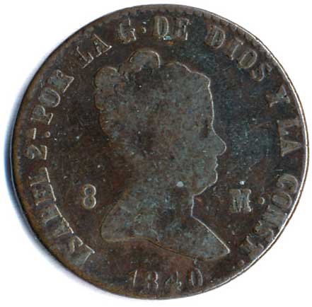 | 961. | 8 Maravedis 1840, Isabel II. 1836-1858 | 1-2- | 130,- | --.- |
