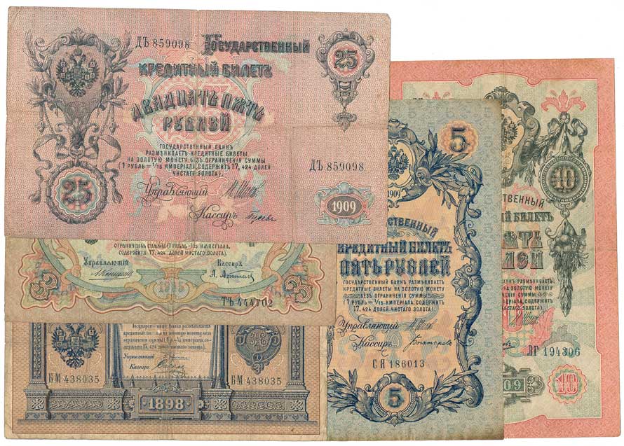 | 2133. | 1,3,5,10,25 Rublů, 1898,1905,1909,1909,1909, 6ks | - | 120,- | --.- |